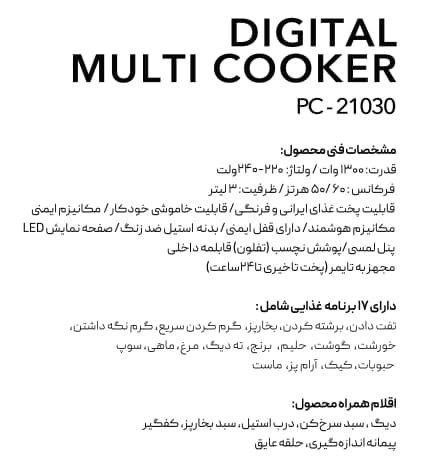 ولتاژ 240 – 220 ولت/فرکانس 50 – 60 هرتز/ظرفیت 3 لیتر/قدرت 1300 وات/پخت غذای ایرانی و فرنگی/قابلیت خاموشی خودکار، مکانیزم ایمنی/بدنه استیل ضد زنگ/مکانیزم هوشمند/ دستگیره درب با حالت قرار دادن ایستاده/صفحه نمایش LCD/پنل لمسی/پوشش نچسب (تفلون) قابلمه داخلی /مجهز به تایمر، پخت/تاخیری تا ۲۴ساعت / دارای ۲۰ برنامه غذایی شامل:تفت دادن برشته کردن, بخارپز,گرم کردن سریع,گرم نگه داشتن,خورشت,گوشت ,حلیم,برنج,ته دیگ,مرغ, ماهی, سوپ حبوبات،کیک، آرام پز,ماست، مربا / اقلام همراه محصول: دیگ، درب شیشهای جداگانه:کفگیر،پیمانه اندازهگیری
